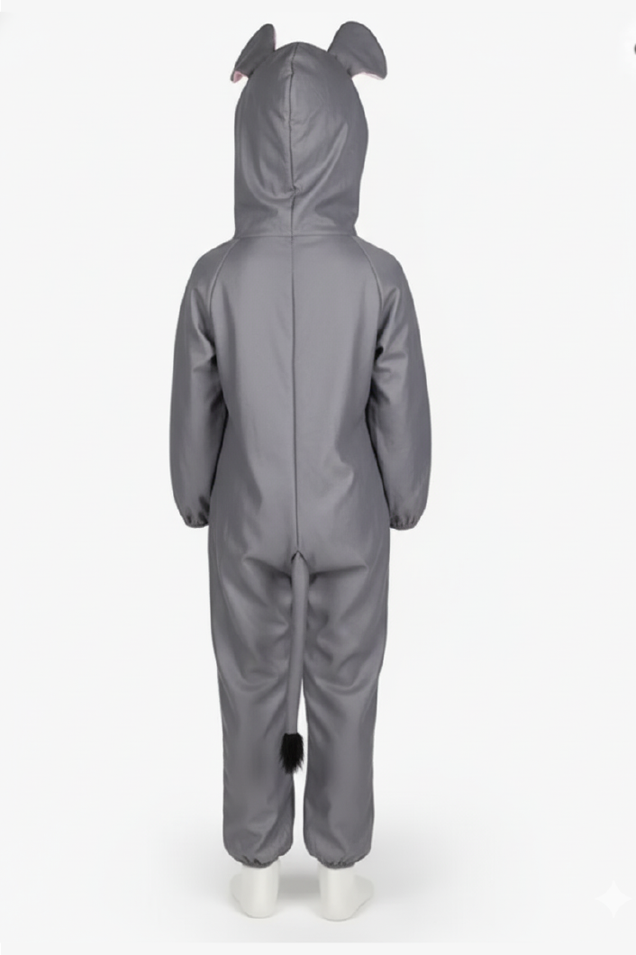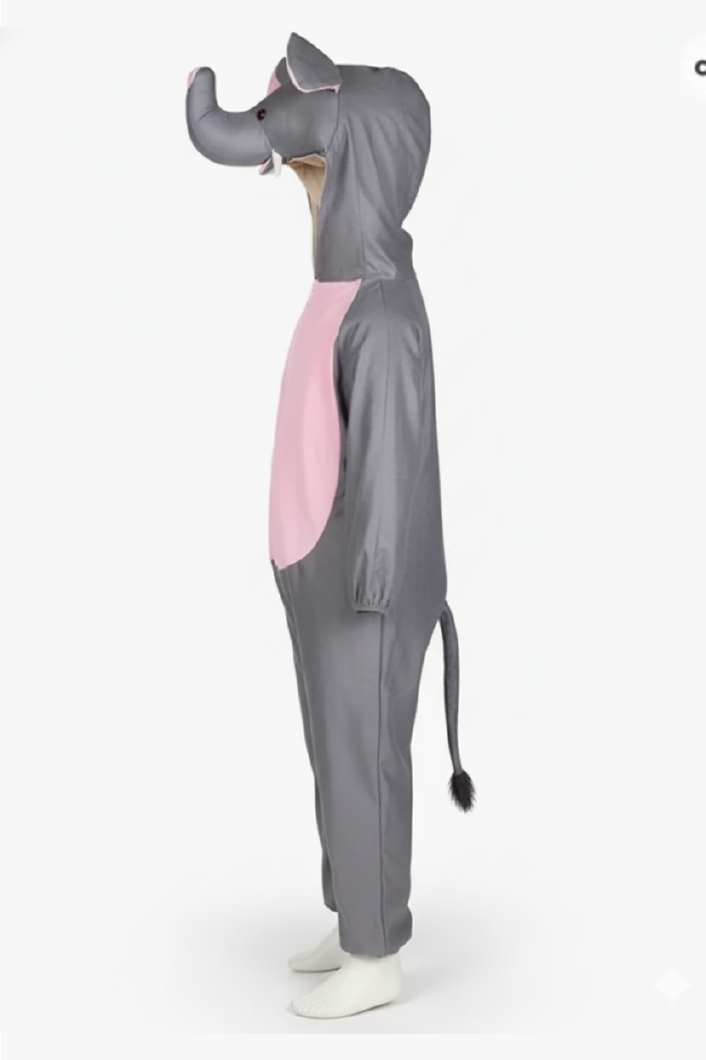 Our adorable Elephant costume captures the gentle nature of the beloved animal. The jumpsuit is crafted from a durable, yet soft fabric in classic grey, complemented by a light pink chest panel and ear lining. The hood features a well-stitched trunk and large ears, completing the Haathi look without being bulky. The one-piece design ensures quick dressing and is sanitized professionally after every use.