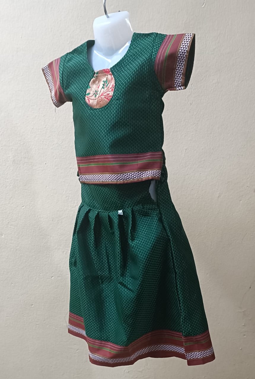 The set is simple yet elegant, perfect for festivals, traditional ceremonies, cultural events, or family functions. The coordinating colors and classic borders give it a traditional South Indian charm ideal for young girls.